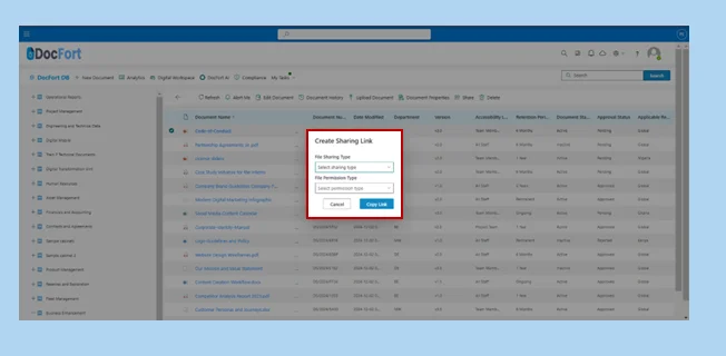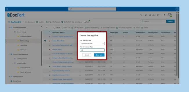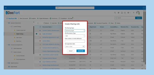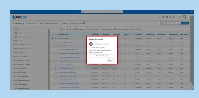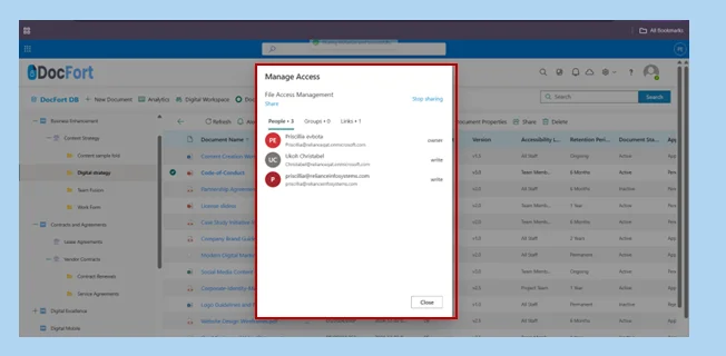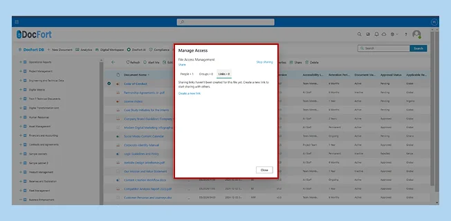 The Manage Access module in DocFort allows users to control document sharing by revoking access from individuals or multiple recipients simultaneously. Users can also stop sharing documents in bulk and securely send files to external parties directly from the menu.